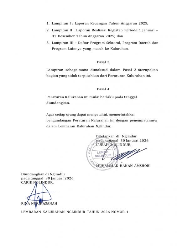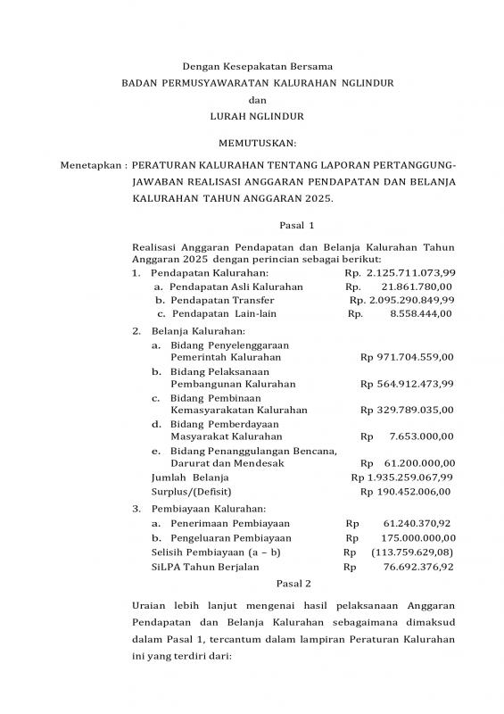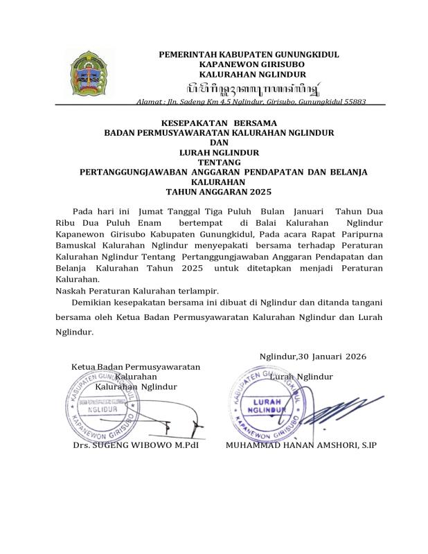 Sebagai bentuk transparansi Pemerintah Kalurahan Nglindur Kapanewon Girisubo, disampaikan melalui website resmi Kalurahan Nglindur foto berkas Perkal tentang pertanggungjawaban APBKal tahun 2025.